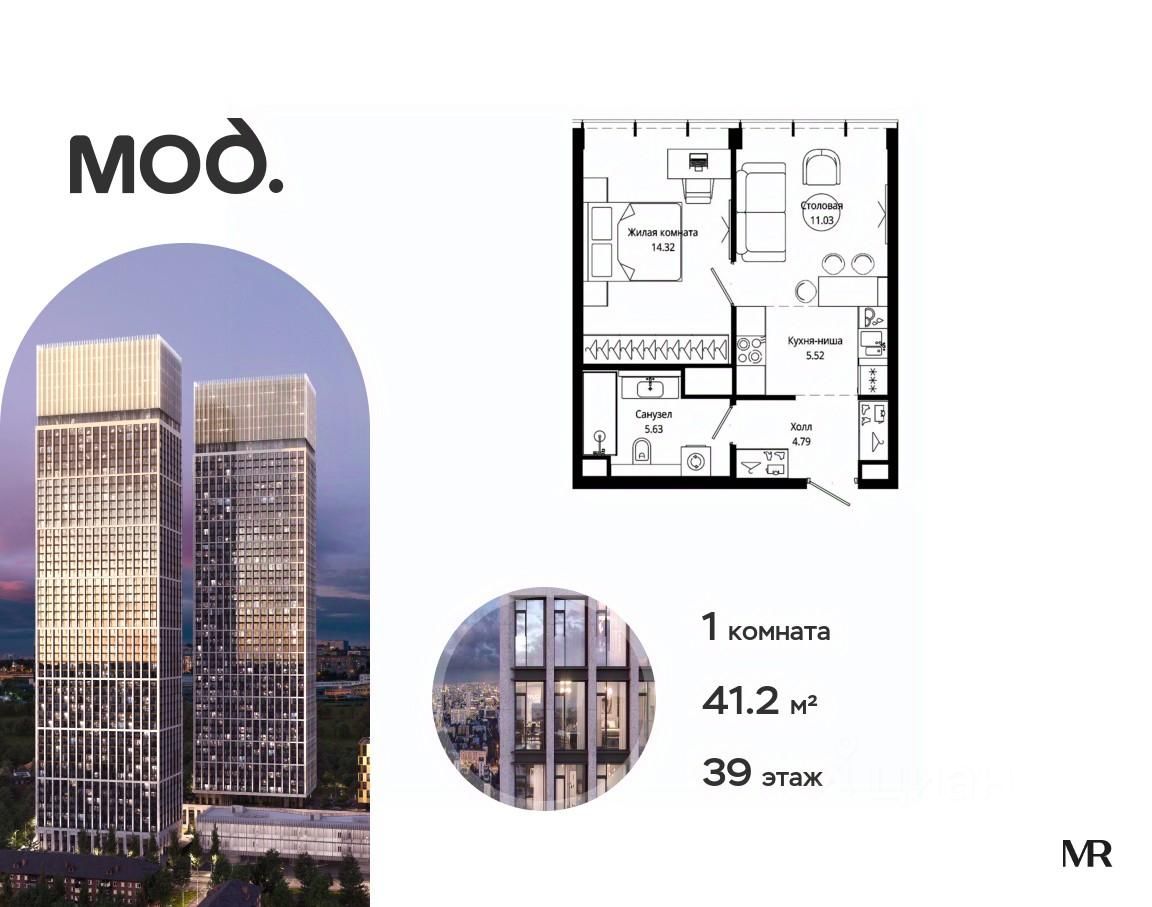 Продается 1-комнатная квартира общей площадью 41.20 м² без отделки в ЖК премиум-класса Мод на 39-м этаже 44 этажного дома.