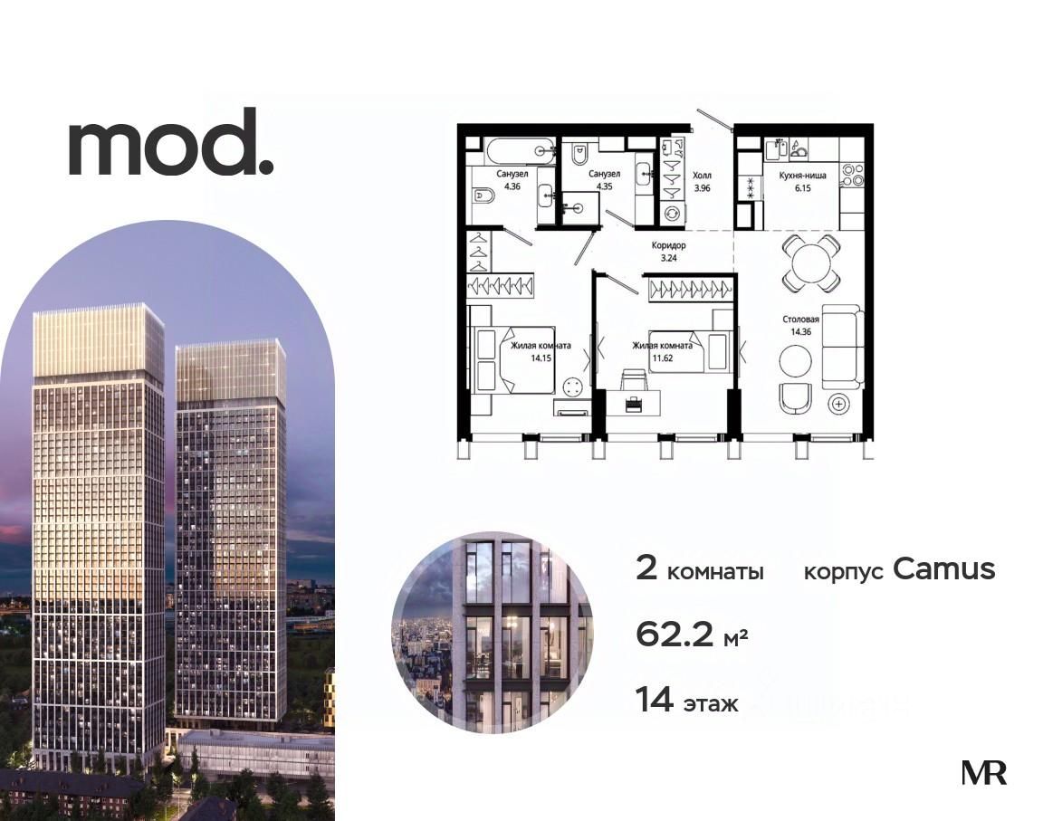 Продается 2-комнатная квартира общей площадью 62.20 м² с предчистовой отделкой в ЖК премиум-класса Mod на 14-м этаже 44 этажного дома.