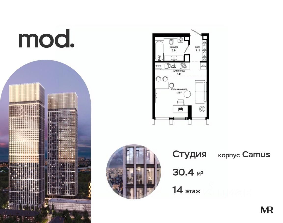 Продается студия общей площадью 30.40 м² с предчистовой отделкой в ЖК премиум-класса Mod на 14-м этаже 44 этажного дома.