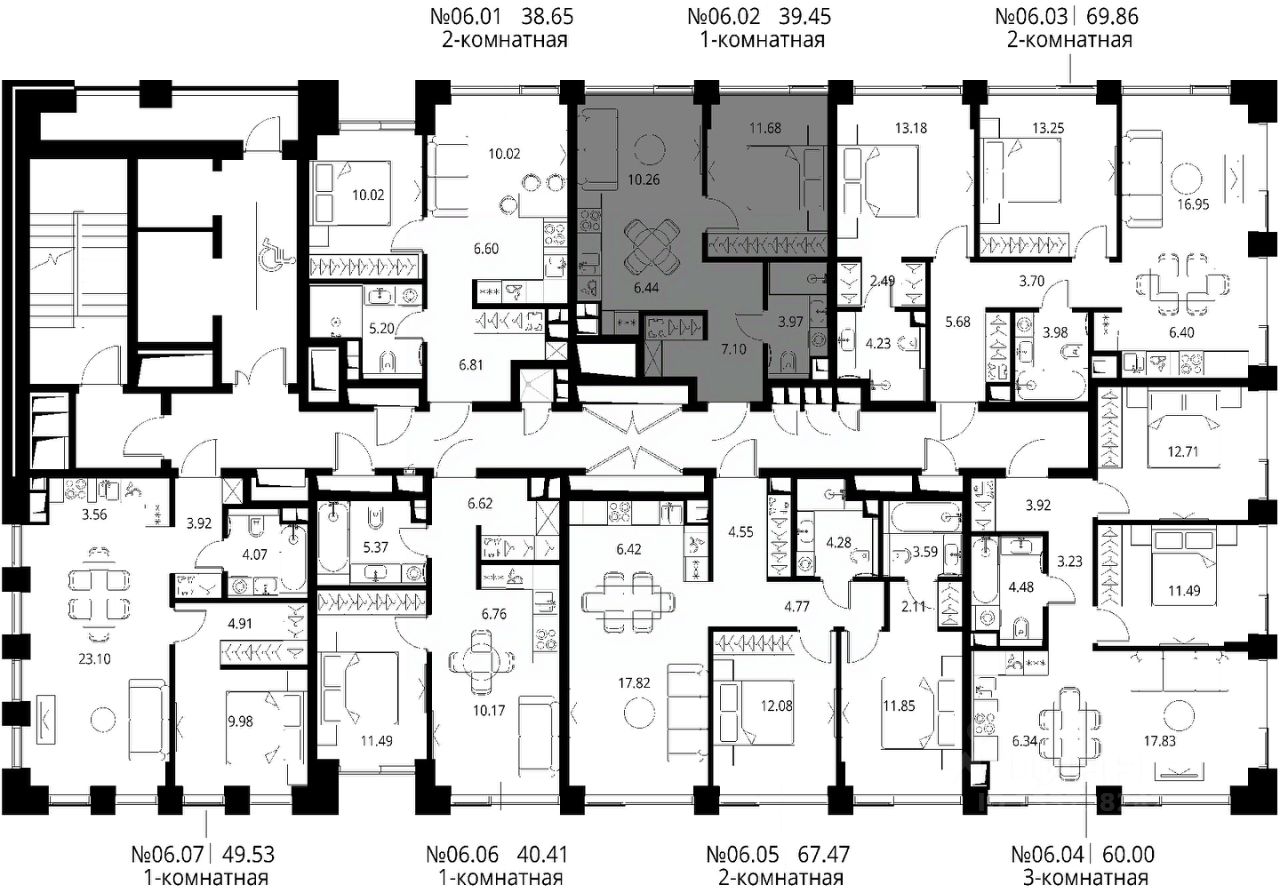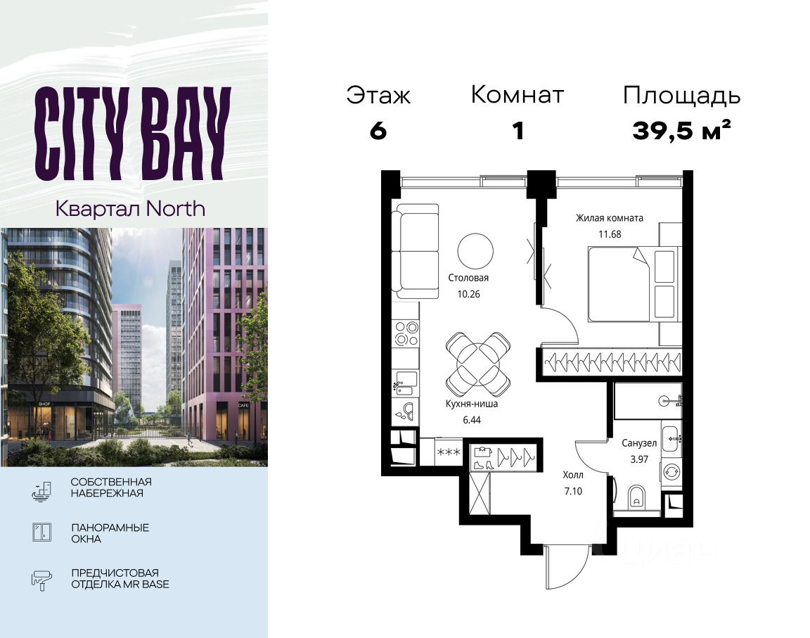 Продаётся 1-комнатная квартира общей площадью 39.45 м² с предчистовой отделкой в ЖК City Вау, квартале North, на 6-м этаже 21 этажного дома.