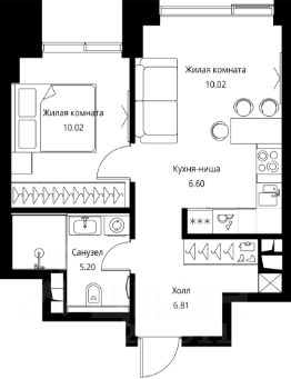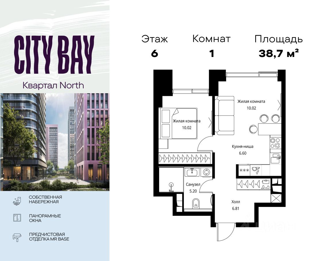 Продаётся 1-комнатная квартира общей площадью 38.65 м² с предчистовой отделкой в ЖК City Вау, квартале North, на 6-м этаже 21 этажного дома.