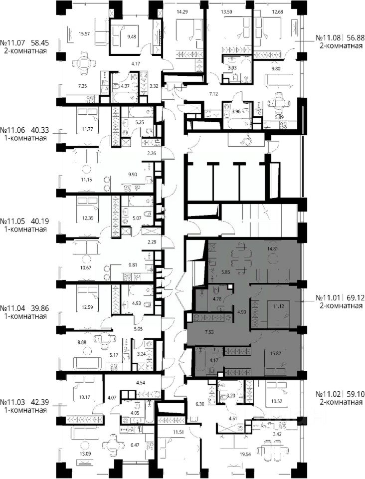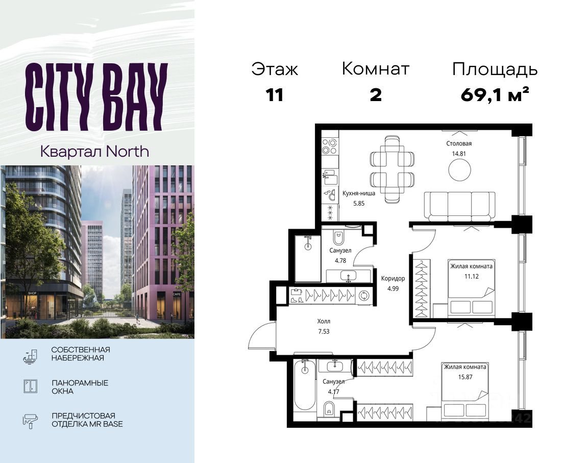 Продаётся 2-комнатная квартира общей площадью 69.12 м² с предчистовой отделкой в ЖК City Вау, квартале North, на 11-м этаже 27 этажного дома.