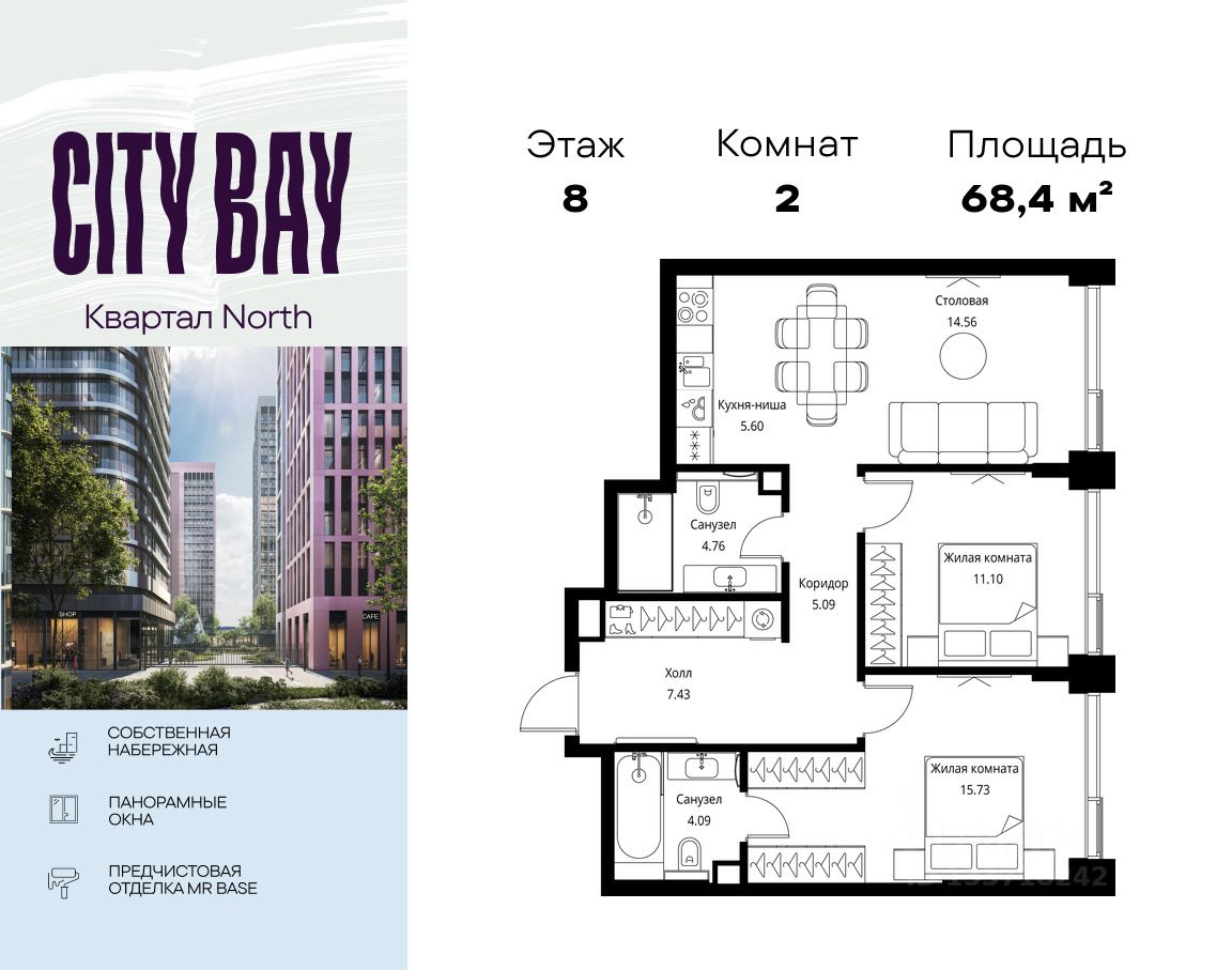 Продаётся 2-комнатная квартира общей площадью 68.36 м² с предчистовой отделкой в ЖК City Вау, квартале North, на 8-м этаже 27 этажного дома.