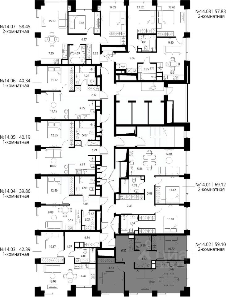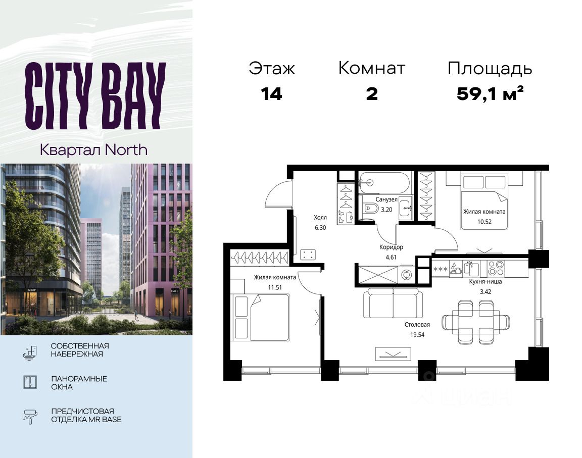 Продаётся 2-комнатная квартира общей площадью 59.10 м² с предчистовой отделкой в ЖК City Вау, квартале North, на 14-м этаже 27 этажного дома.