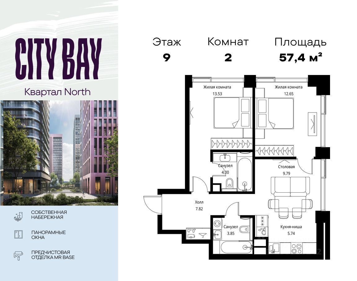 Продаётся 2-комнатная квартира общей площадью 57.38 м² с предчистовой отделкой в ЖК City Вау, квартале North, на 9-м этаже 27 этажного дома.