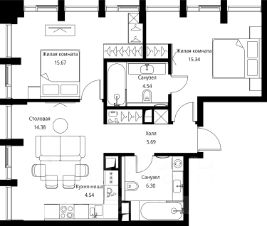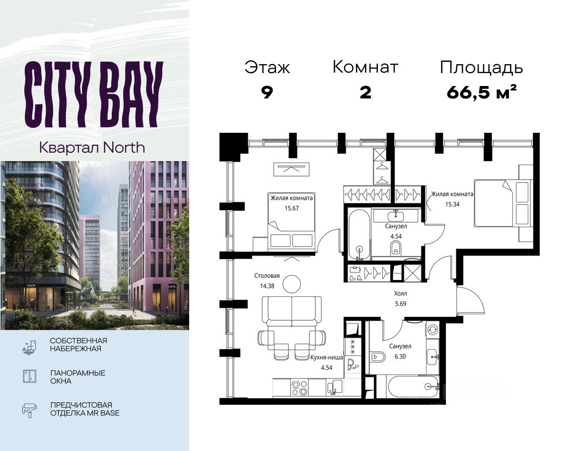 Продаётся 2-комнатная квартира общей площадью 66.46 м² с предчистовой отделкой в ЖК City Вау, квартале North, на 9-м этаже 19 этажного дома.