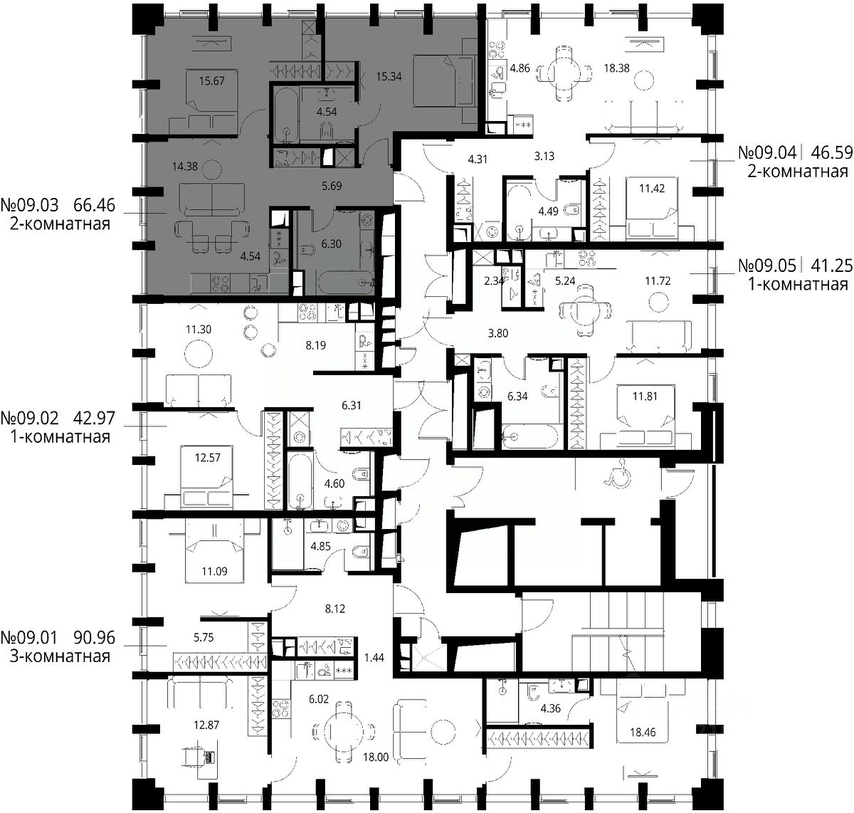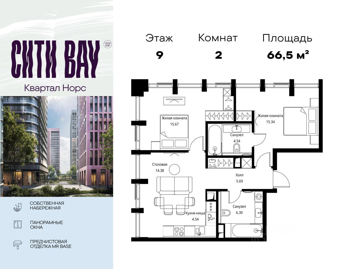 Продаётся 2-комнатная квартира общей площадью 66.46 м² с предчистовой отделкой в ЖК Сити Бэй, квартале Норс, на 9-м этаже 19 этажного дома.