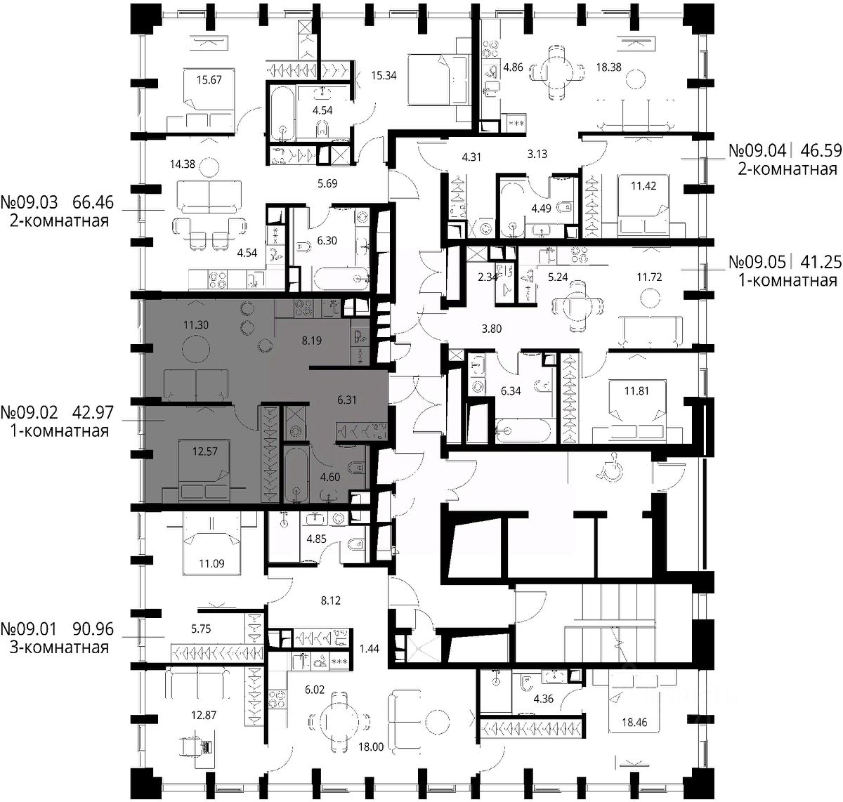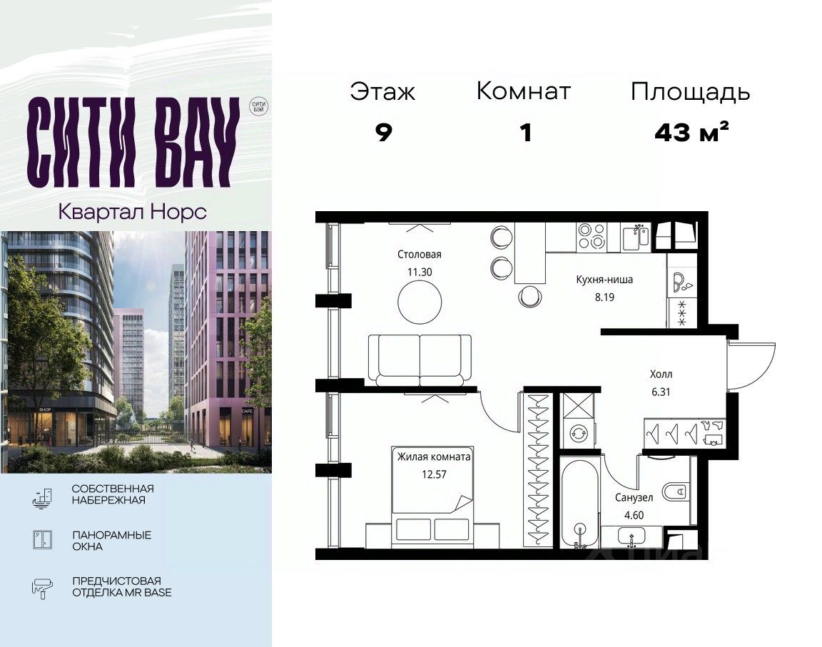 Продаётся 1-комнатная квартира общей площадью 42.97 м² с предчистовой отделкой в ЖК Сити Бэй, квартале Норс, на 9-м этаже 19 этажного дома.