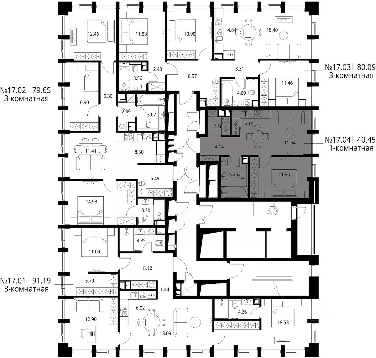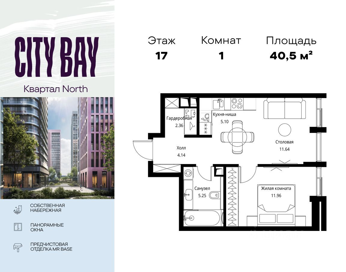 Продаётся 1-комнатная квартира общей площадью 40.45 м² с предчистовой отделкой в ЖК City Вау, квартале North, на 17-м этаже 19 этажного дома.