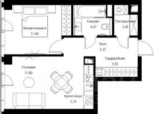 Продаётся 1-комнатная квартира общей площадью 44.83 м² с предчистовой отделкой в ЖК City Вау, квартале North, на 17-м этаже 49 этажного дома.