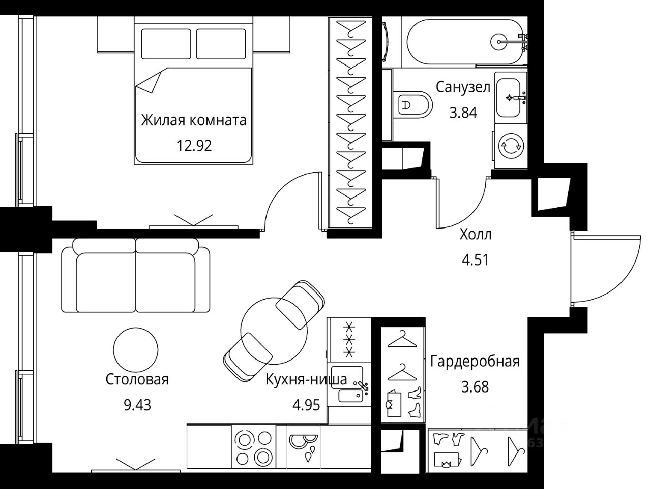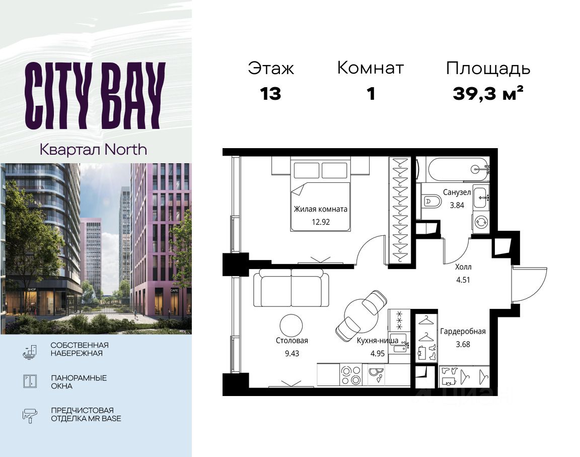 Продаётся 1-комнатная квартира общей площадью 39.33 м² с предчистовой отделкой в ЖК City Вау, квартале North, на 13-м этаже 26 этажного дома.