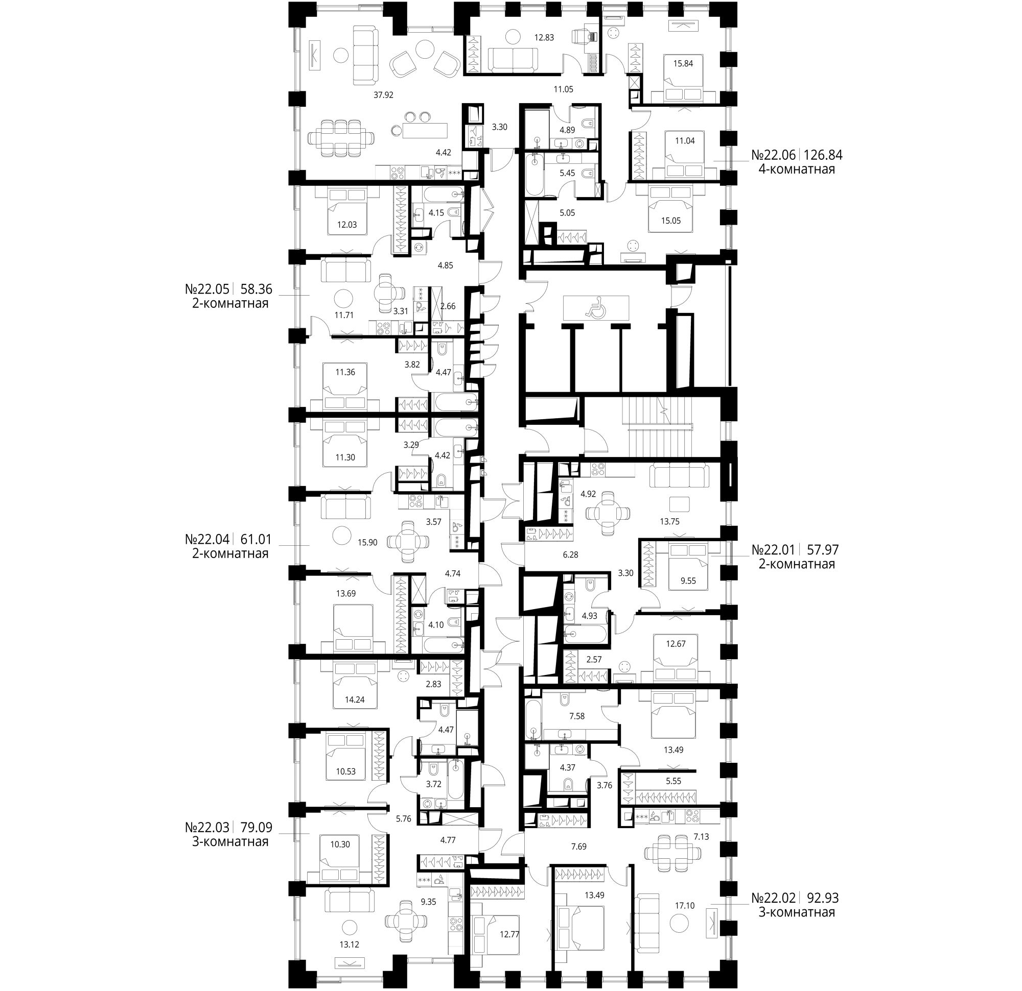 Продаётся 2-комнатная квартира общей площадью 61.01 м² с предчистовой отделкой в ЖК Сити Бэй, квартале Норс, на 22-м этаже 26 этажного дома.