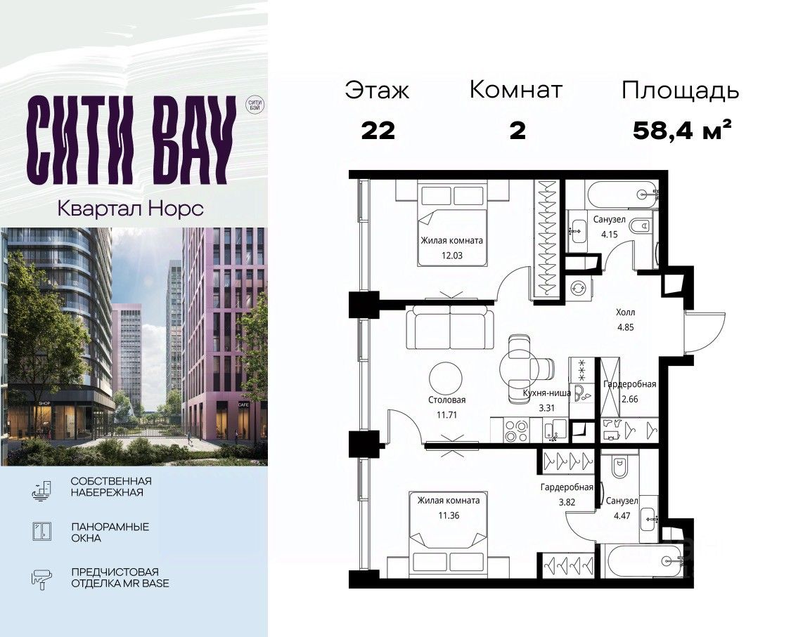 Продаётся 2-комнатная квартира общей площадью 58.36 м² с предчистовой отделкой в ЖК Сити Бэй, квартале Норс, на 22-м этаже 26 этажного дома.