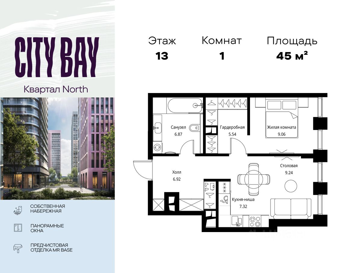 Продаётся 1-комнатная квартира общей площадью 44.95 м² с предчистовой отделкой в ЖК City Вау, квартале North, на 13-м этаже 26 этажного дома.