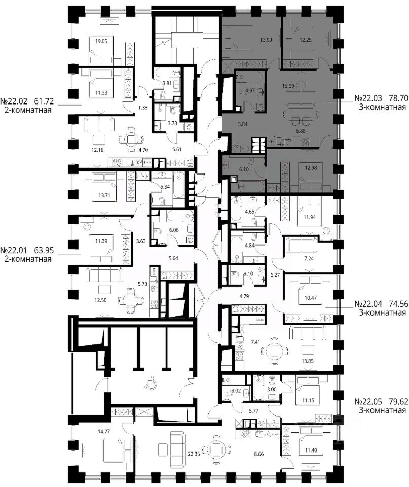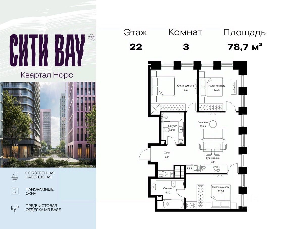 Продаётся 3-комнатная квартира общей площадью 78.70 м² с предчистовой отделкой в ЖК Сити Бэй, квартале Норс, на 22-м этаже 27 этажного дома.