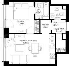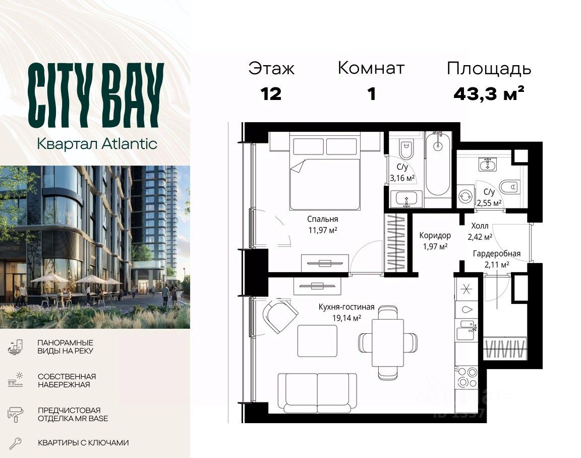 Продаётся 1-комнатная квартира общей площадью 43.32 м² с предчистовой отделкой в ЖК City Вау на 12-м этаже 53 этажного дома.