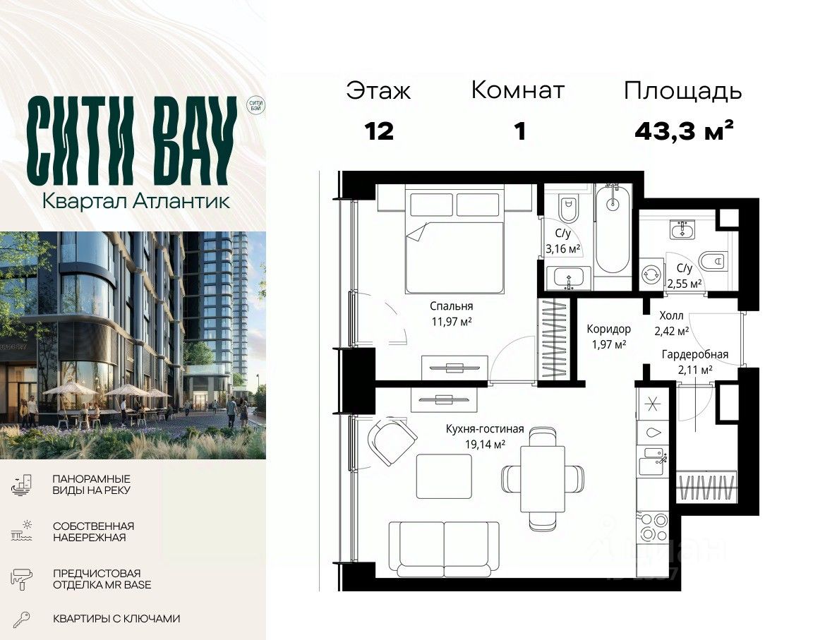 Продаётся 1-комнатная квартира общей площадью 43.32 м² с предчистовой отделкой в ЖК Сити Бэй на 12-м этаже 53 этажного дома.