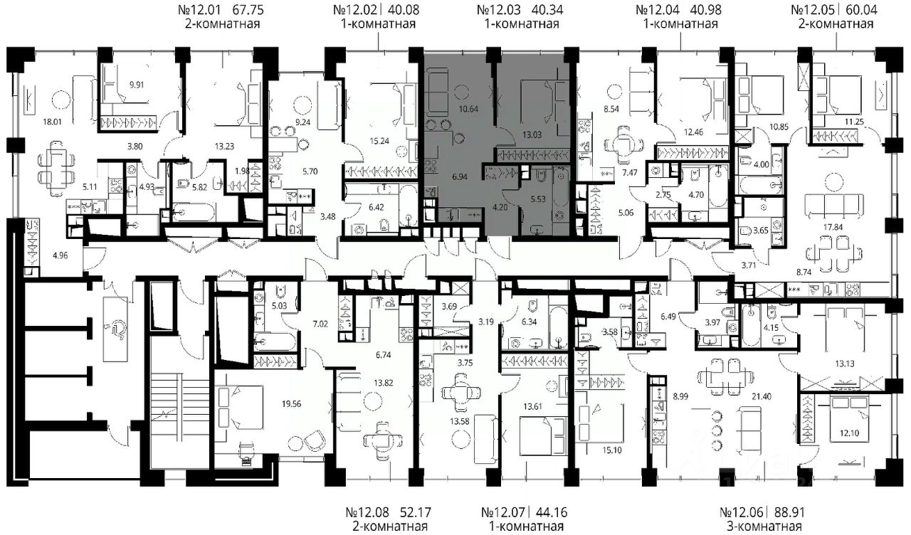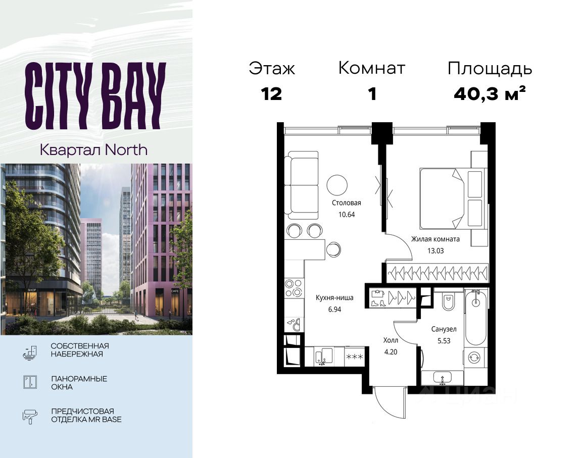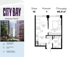 Продаётся 1-комнатная квартира общей площадью 40.34 м² с предчистовой отделкой в ЖК City Вау, квартале North, на 12-м этаже 27 этажного дома.
