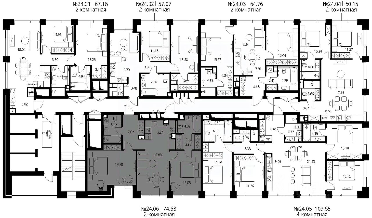 Продаётся 2-комнатная квартира общей площадью 74.68 м² с предчистовой отделкой в ЖК City Вау, квартале North, на 24-м этаже 27 этажного дома.