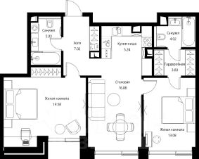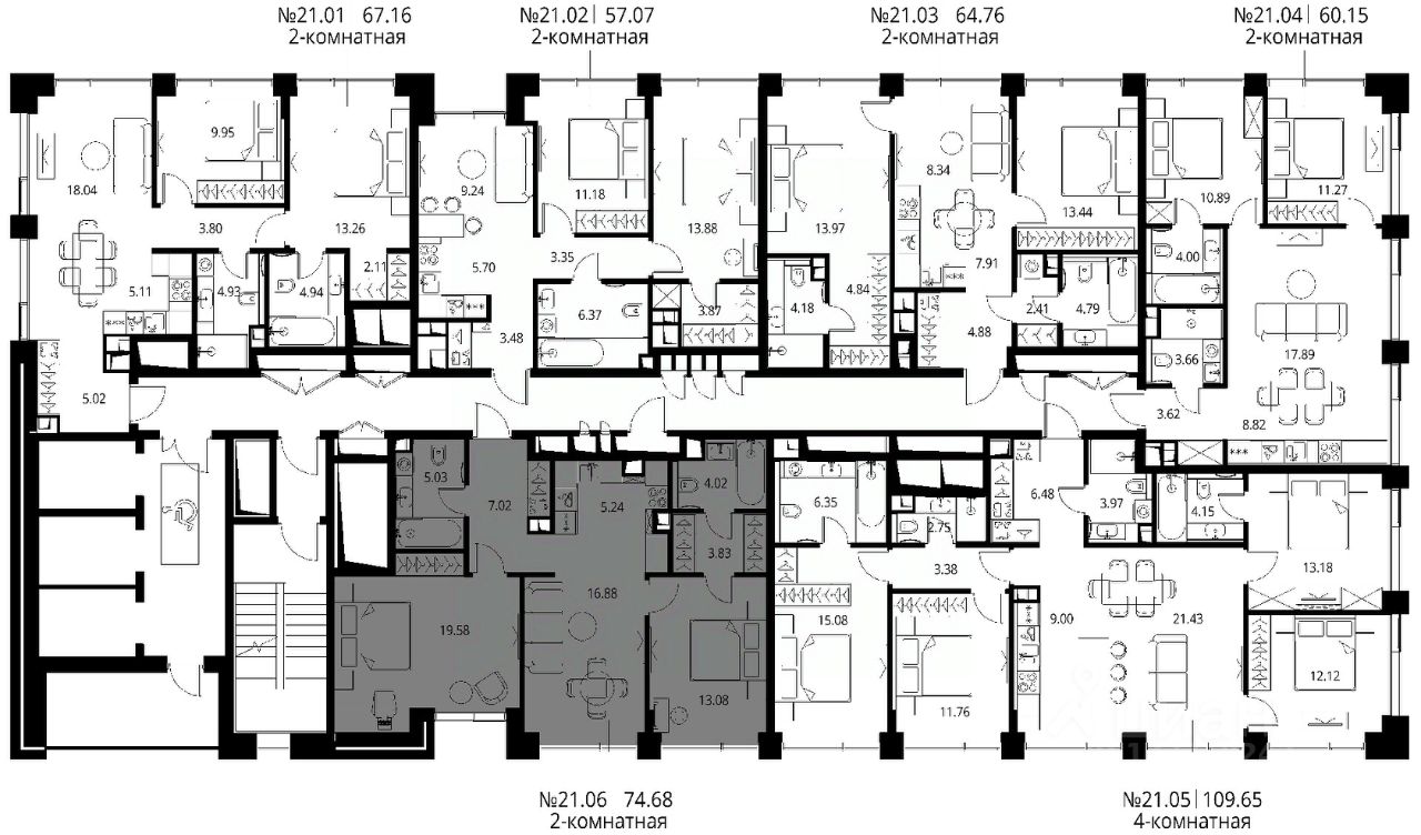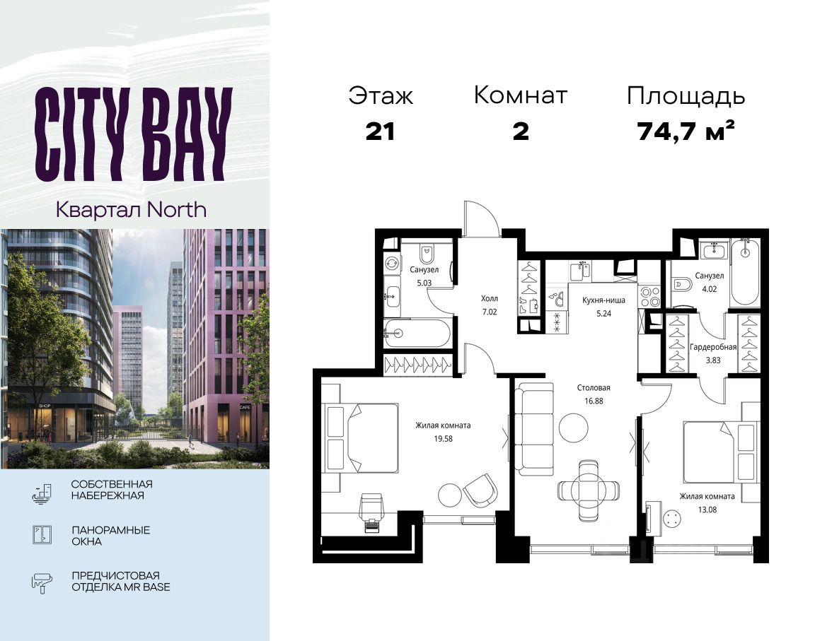 Продаётся 2-комнатная квартира общей площадью 74.68 м² с предчистовой отделкой в ЖК City Вау, квартале North, на 21-м этаже 27 этажного дома.