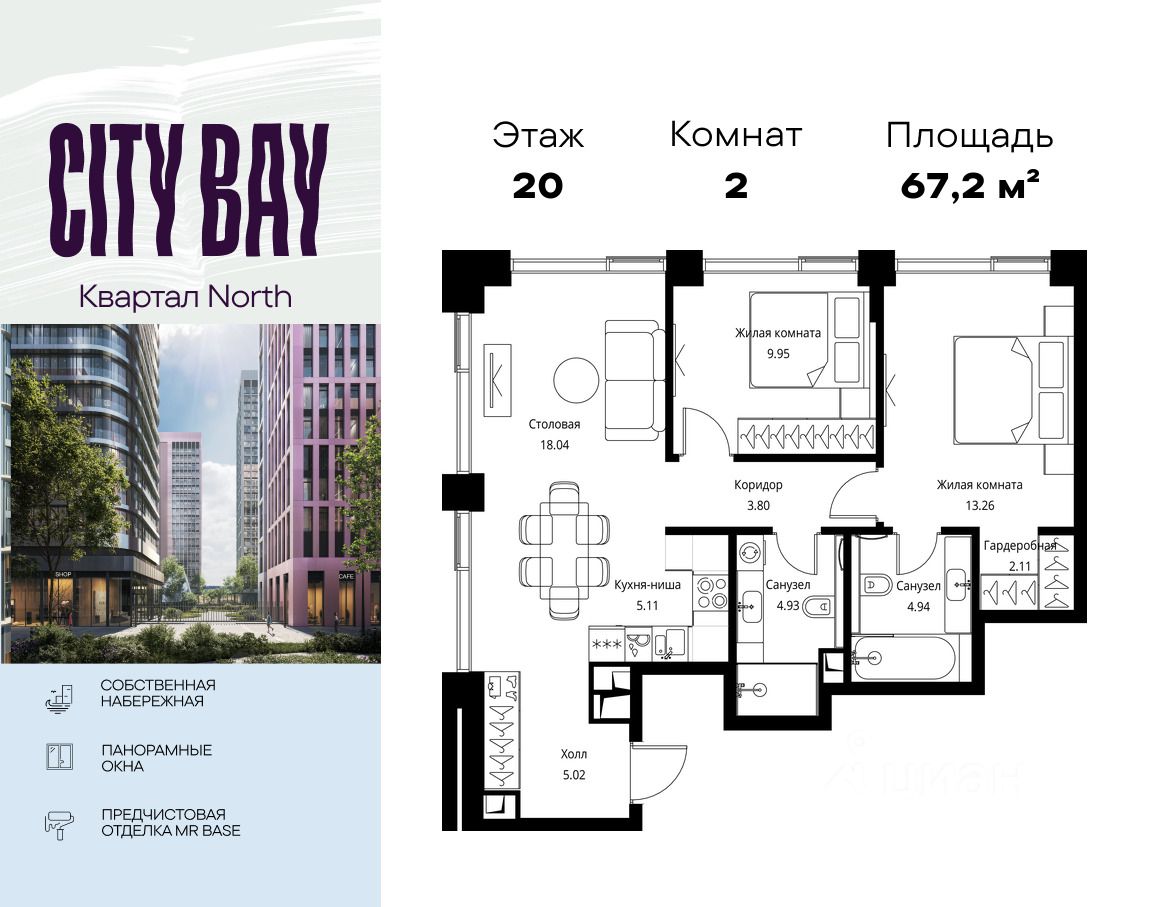 Продаётся 2-комнатная квартира общей площадью 67.16 м² с предчистовой отделкой в ЖК City Вау, квартале North, на 20-м этаже 27 этажного дома.