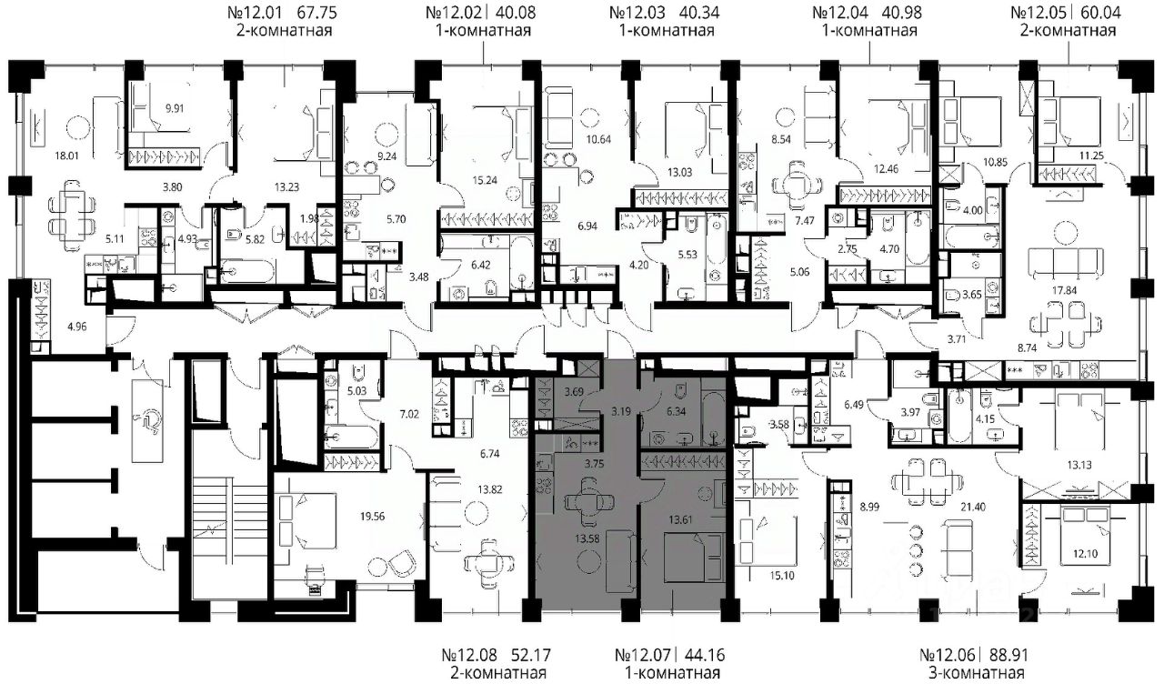Продаётся 1-комнатная квартира общей площадью 44.16 м² с предчистовой отделкой в ЖК Сити Бэй, квартале Норс, на 12-м этаже 27 этажного дома.