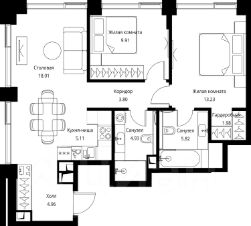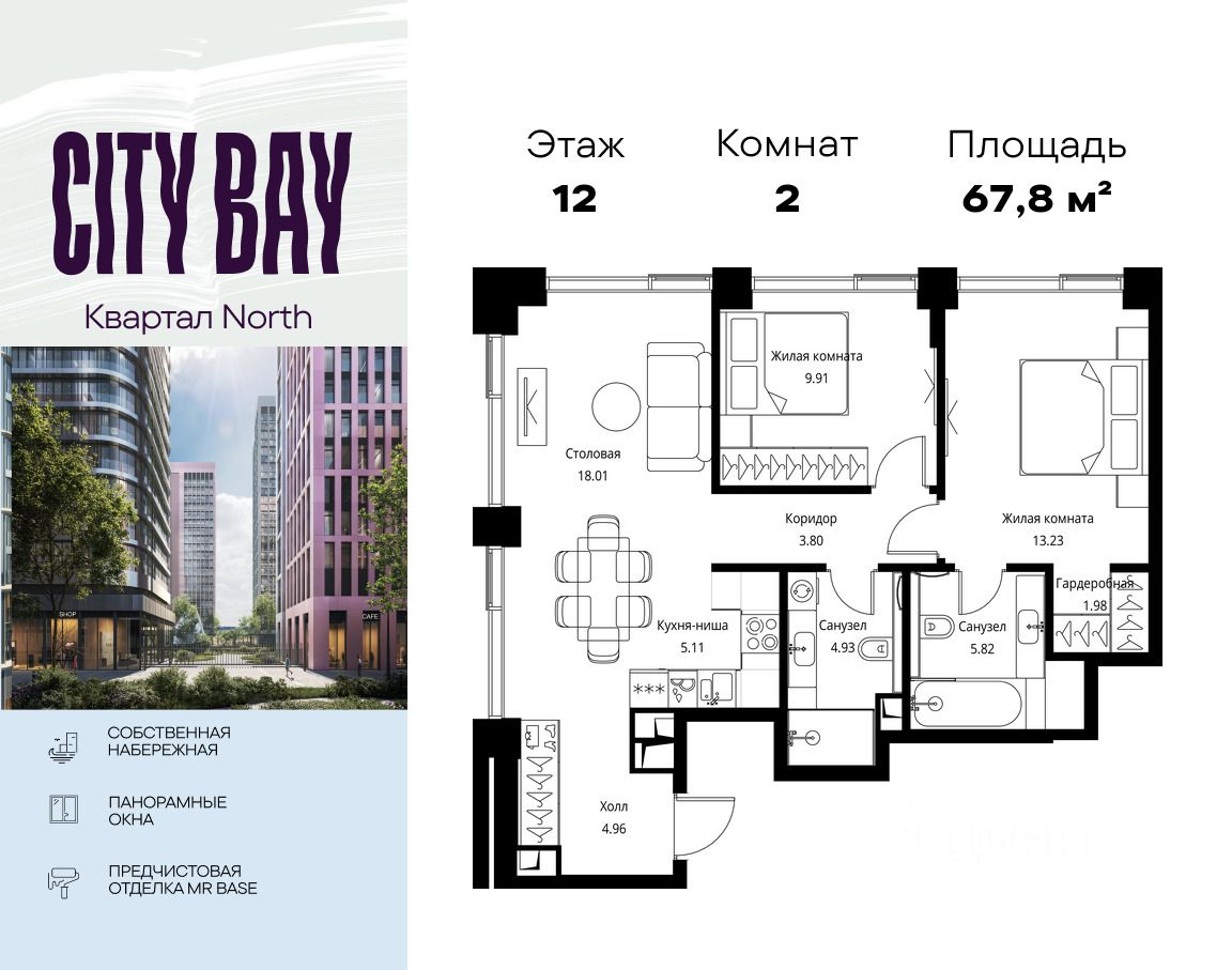 Продаётся 2-комнатная квартира общей площадью 67.75 м² с предчистовой отделкой в ЖК City Вау, квартале North, на 12-м этаже 27 этажного дома.