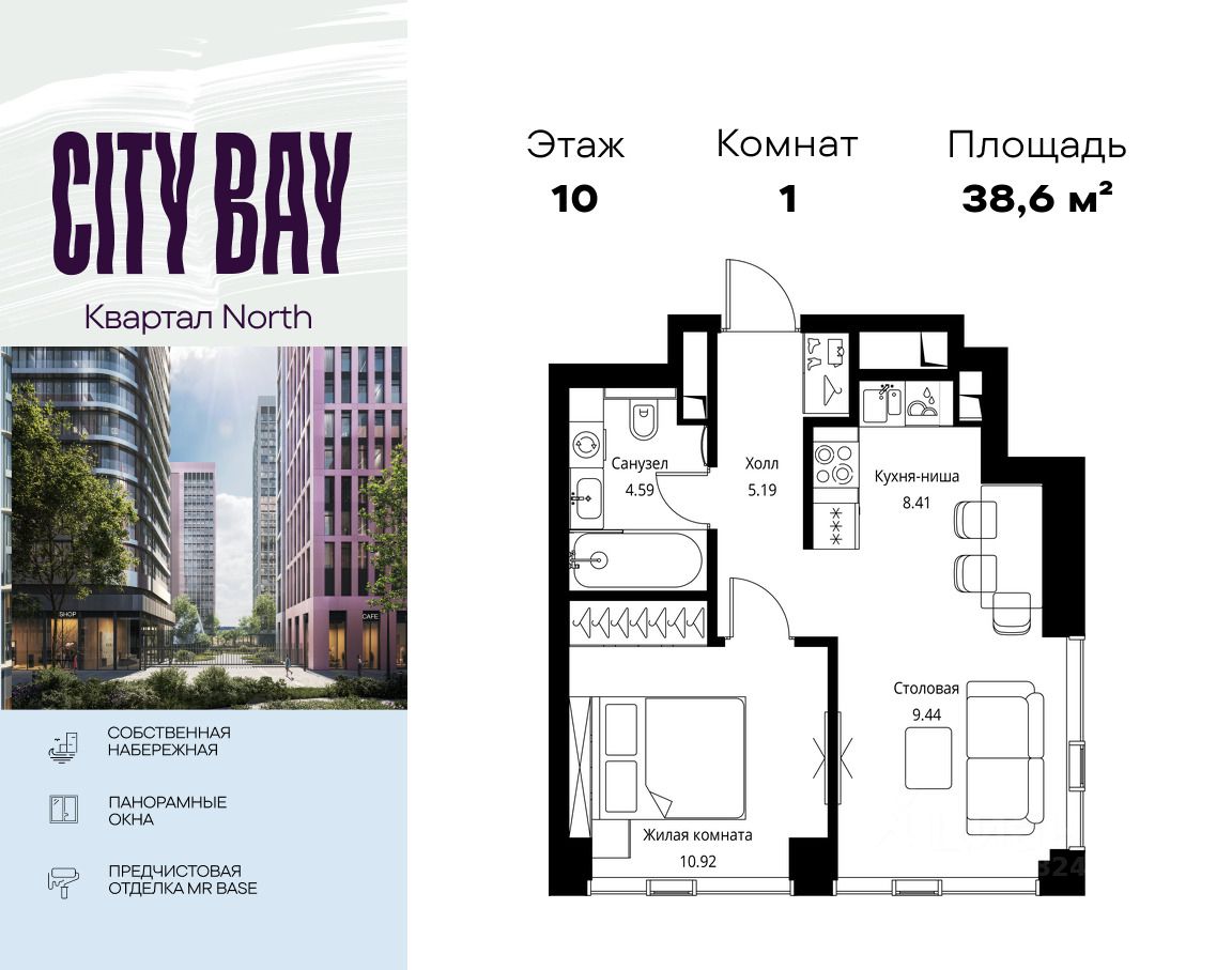 Продаётся 1-комнатная квартира общей площадью 38.55 м² с предчистовой отделкой в ЖК City Вау, квартале North, на 10-м этаже 48 этажного дома.
