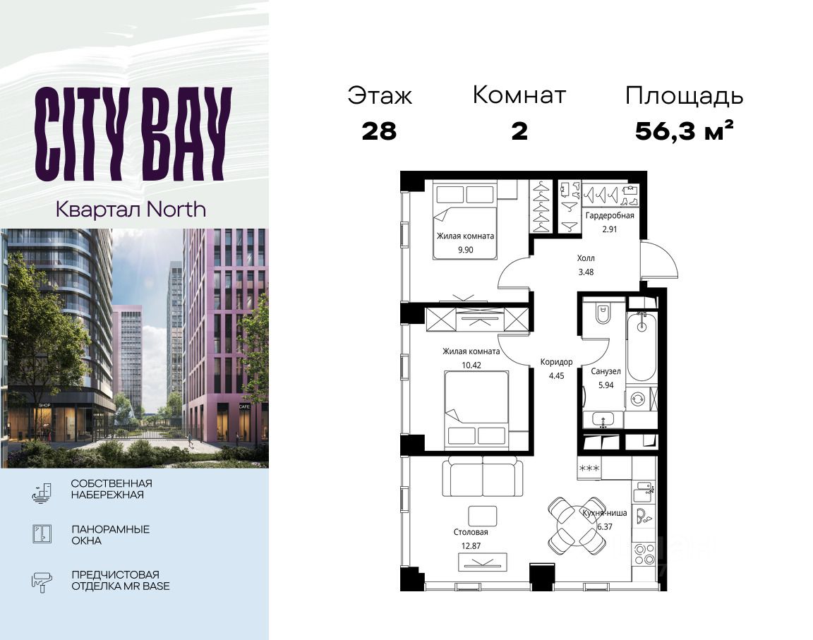 Продаётся 2-комнатная квартира общей площадью 56.34 м² с предчистовой отделкой в ЖК City Вау, квартале North, на 28-м этаже 48 этажного дома.