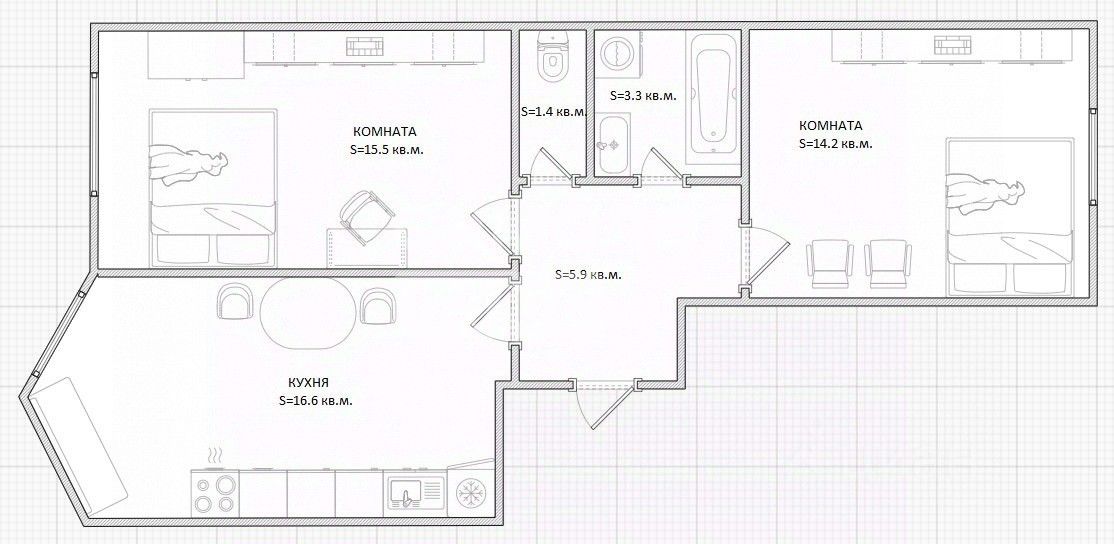 • Просторная кухня-гостиная площадью 16,6 кв.м. — идеальное место для семейных ужинов и встреч с друзьями.