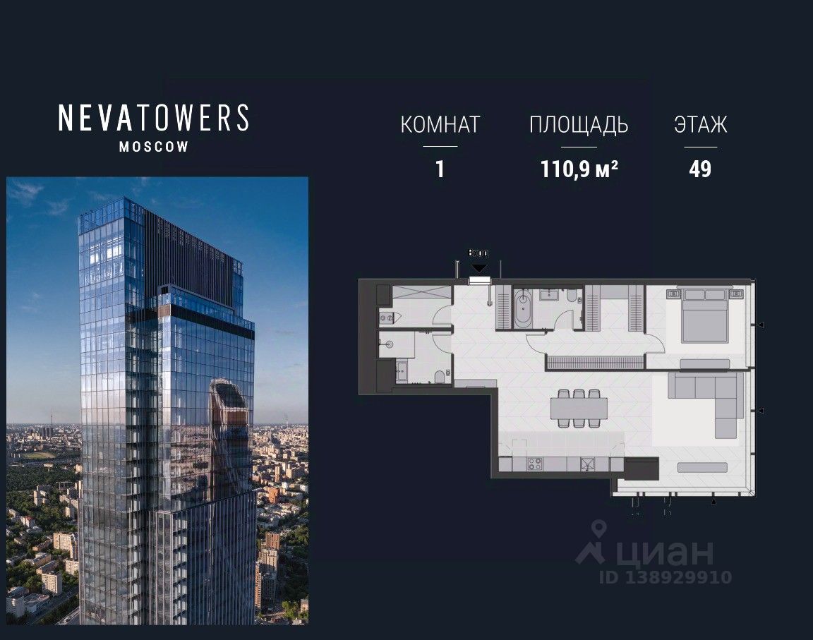 Площадь — 110.9 м², 49 этаж, вид на башни Сити.