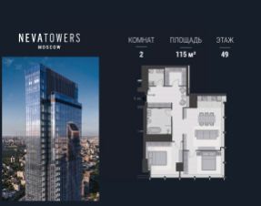Площадь — 115 м², 49 этаж, вид на башни Сити.