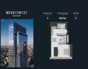 Площадь — 54.9 м², 3 этаж, вид на башни Сити.