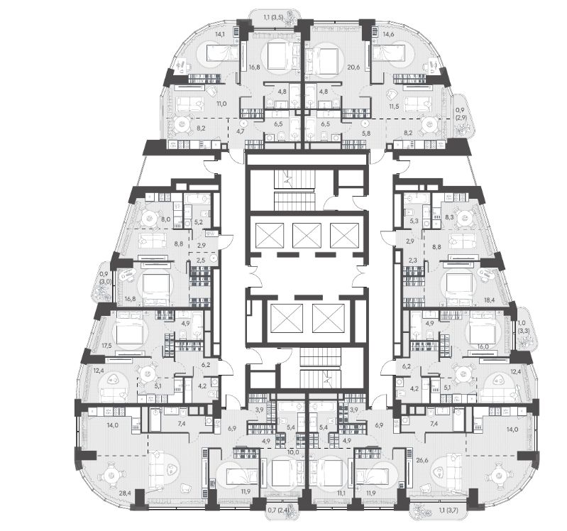 - Здоровая среда (биохакинг-центр, фитнес-зал и спортивная инфраструктура во дворе, медитационные пространства, инженерные решения для освещения, свежего воздуха и очистки воды, сервисы красоты и поддержания активного долголетия);