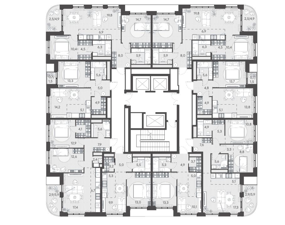- Здоровая среда (биохакинг-центр, фитнес-зал и спортивная инфраструктура во дворе, медитационные пространства, инженерные решения для освещения, свежего воздуха и очистки воды, сервисы красоты и поддержания активного долголетия);