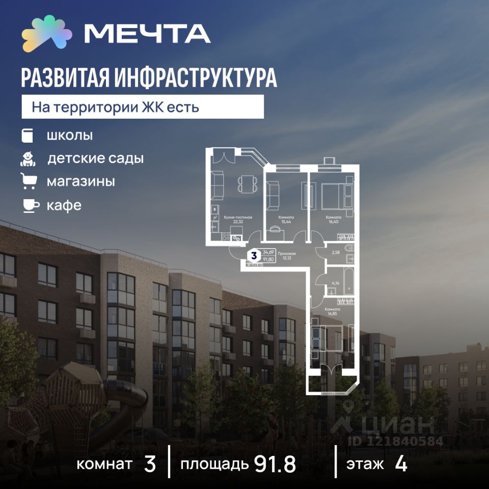 Продается трехкомнатная квартира в квартале "Дружба" жилого комплекса "Мечта". Общая площадь квартиры: 91.8 кв. м, этаж 4 из 5.