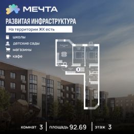 Продается трехкомнатная квартира в квартале "Любовь" жилого комплекса "Мечта". Общая площадь квартиры: 92.69 кв. м, этаж 3 из 5.