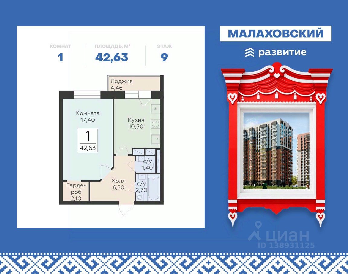 Продается 1-к квартира площадью 42.63 кв. м с черновой отделкой. Квартира расположена на 9 этаже 17 этажного дома, в 202 корпусе.