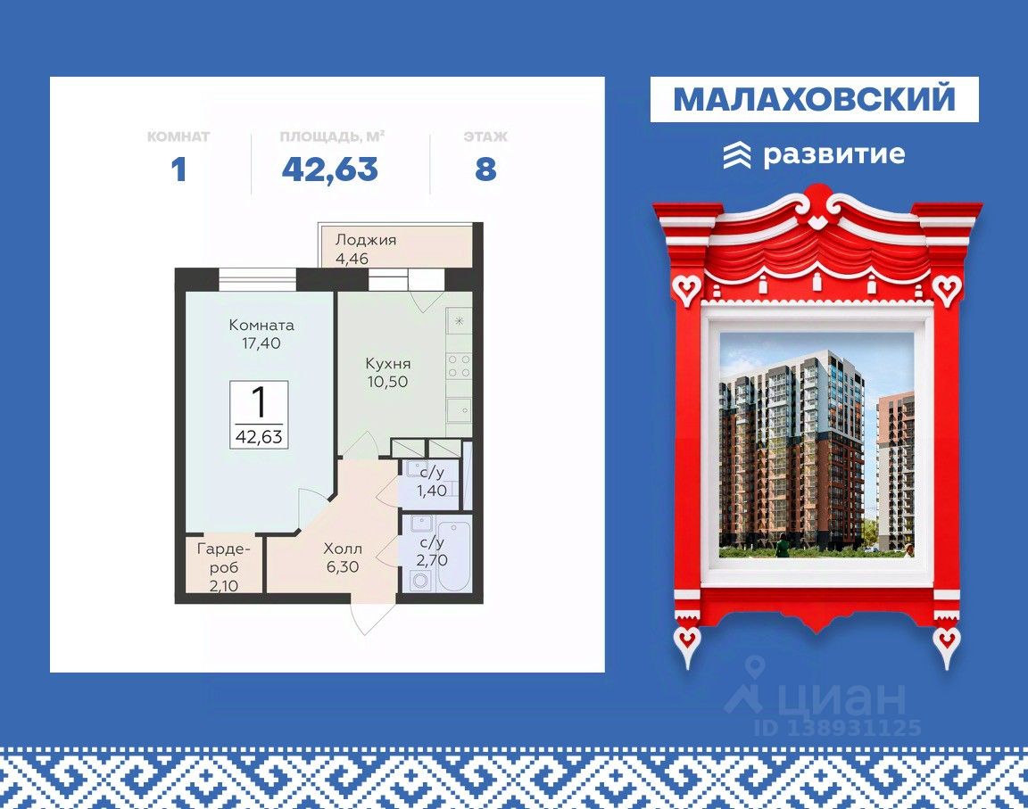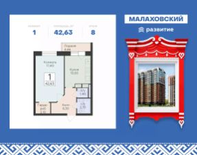 Продается 1-к квартира площадью 42.63 кв. м с черновой отделкой. Квартира расположена на 8 этаже 17 этажного дома, в 203 корпусе.