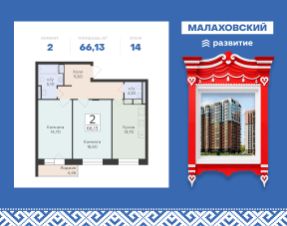 Продается 2-к квартира площадью 66.13 кв. м с черновой отделкой. Квартира расположена на 14 этаже 17 этажного дома, в 203 корпусе.