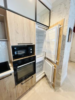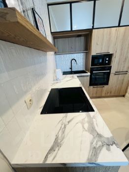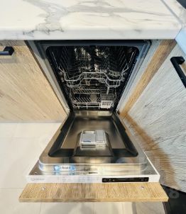 Кухня укомплектована современной мебелью, варочный панелью, духовым шкафом, посудомоечной машиной, холодильником и микроволновой печью.