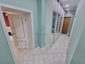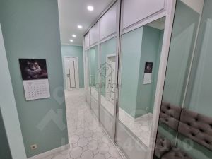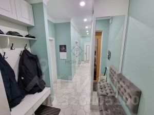 В коридоре площадью 12 м² — большой встроенный зеркальный шкафкупе и мебель для прихожей. Установлена современная входная дверь с улучшенной звукоизоляцией. В комнатах — ламинат; в остальных помещениях — плитка.