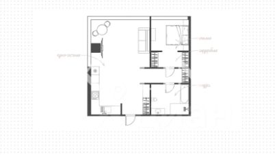 Планировка включает кухню-гостиную, спальню, ванную комнату и прихожую.