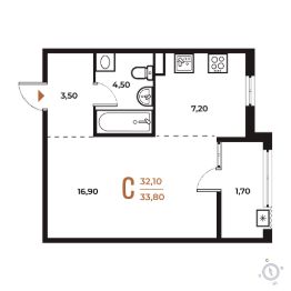 Общая площадь: 33.8 кв.м., жилая: 16.9 кв.м., площадь кухни: 7.2 кв.м. Этаж: 2, квартира 267.