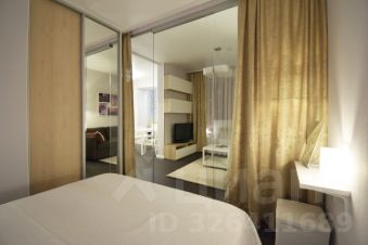 Зона отдыха- спальня, разделена с общим пространством стеклянной перегородкой с раздвижной дверью. Двуспальная кровать с подъемным механизмом и местом для хранения, вместительный шкаф-купе, где свободно можно разместить все необходимое, туалетный столик с пуфом, шторы blackout.