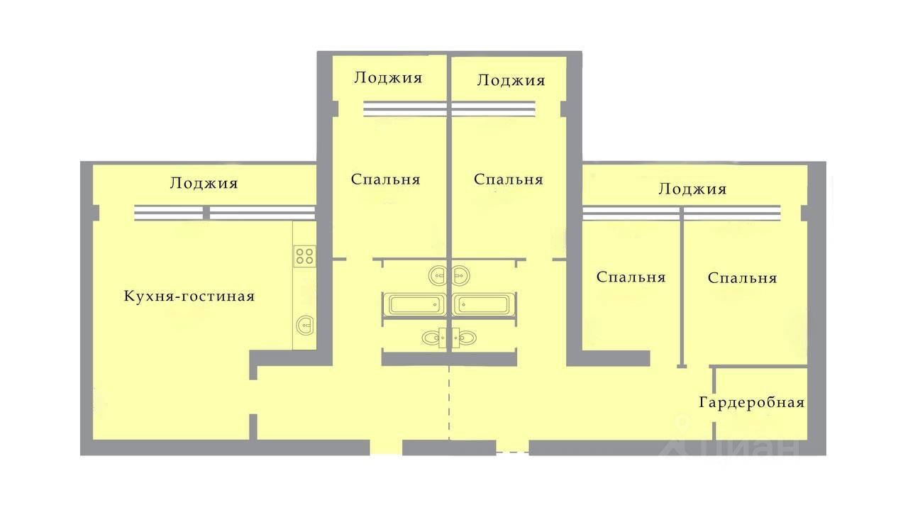 Планировка квартиры включает в себя: кухню, объединенную с гостиной, 4 спальни, два санузла, гардеробную. Две просторные лоджии предлагают замечательные виды и возможность для отдыха на свежем воздухе.