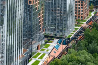 На территории ЖК вертикальная многоуровневая детская площадка, несколько спортивных площадок, зоны для работы, спорта и отдыха.