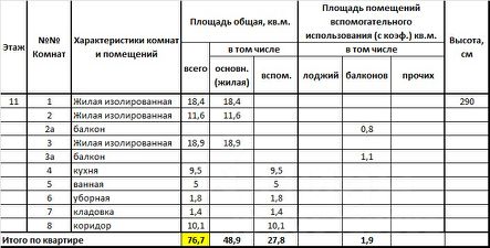 • общая площадь квартиры (без учета балконов) 76,7 кв.м.: