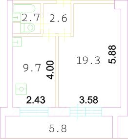 Общая площадь с учетом лоджии 40 м2, кухня-9.7 м2.