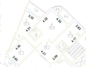 Общая площадь составляет 78,3 м., 2 спальни площадью 10,4 и 12,3 м. кв. с выходом на лоджию, гостинная 18,9 м. и просторная кухня 11,8 м.